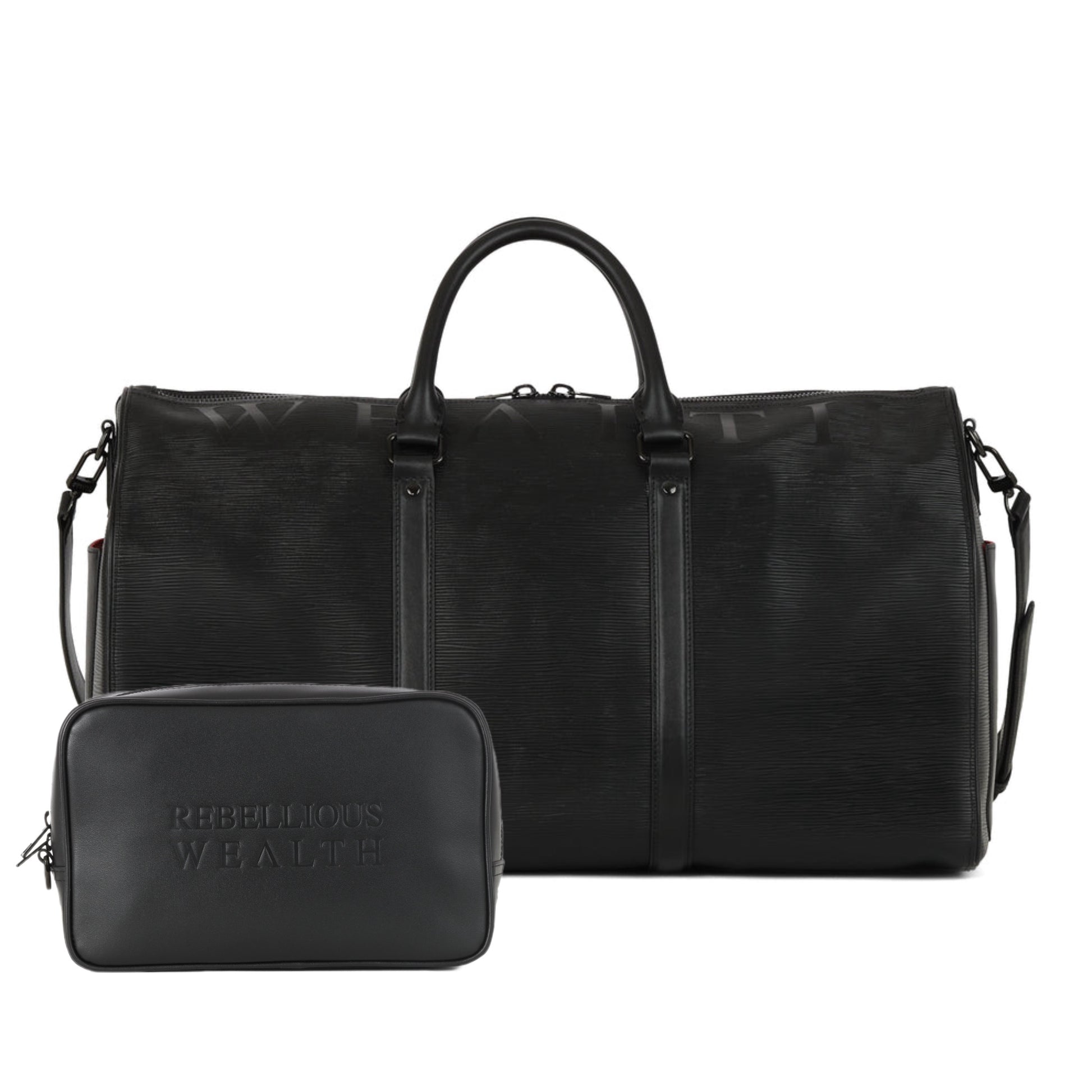 Rebellious Wealth Lifestyle presents the Black Widow Travel Set — featuring the RWLS 114 Black Widow Bag and the RWLS 117 Black Leather Toiletry Bag. Each piece is crafted with precision, designed for those who move with purpose and style.